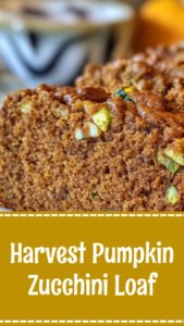 Moist and delicious Harvest Pumpkin Zucchini Loaf! The perfect easy fall recipe for breakfast or a snack. A great way to use your garden’s bounty. #pumpkinbread #zucchinibread #fallbaking #easyloafrecipe #moistpumpkinbread