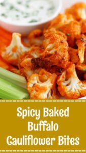 Crispy, spicy baked buffalo cauliflower bites! A healthier, vegan alternative to wings. Perfect for game day or a tasty snack. Easy recipe with amazing flavor. #buffalocauliflower, #veganrecipes, #healthysnacks, #gamedayfood, #easyappetizers